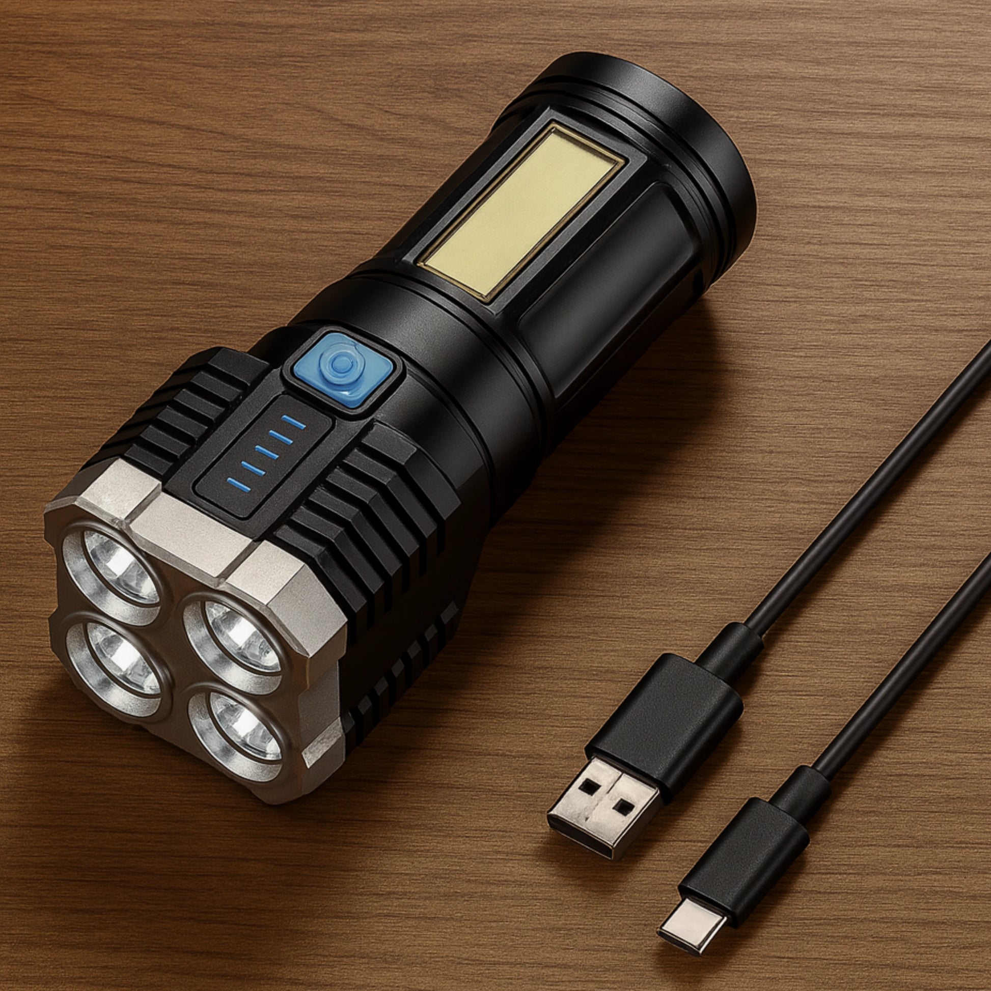 Alterna entre haz frontal de precisión, modo bajo para ahorro extremo, estrobo de emergencia visible a cientos de metros y luz lateral COB tipo “día artificial”. Control total con un solo botón.